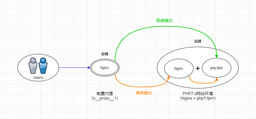 两者区别在于使用高速模式时,前置代理(Nginx)直接将访问请求转发给应用的后端程序(php-fpm)去运行;而使用兼容模式时,前置代理(Nginx)将访问请求先转发给应用内置的Nginx,再由Nginx转发给后端程序(php-fpm)去运行。
